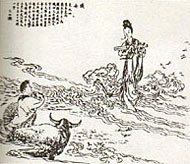 Long, long ago, there was an honest and kind-hearted fellow named Niu Lang (Cowhand). His parents died when he was a child. Later he was driven out of his home by his sister-in-law. So he lived by himself herding cattle and farming. One day, a fairy from heaven Zhi Nu (Weaver Maid) fell in love with him and came down secretly to earth and married him. The cowhand farmed in the field and the Weaver Maid wove at home. They lived a happy life and gave birth to a boy and a girl. Unfortunately, the God of Heaven soon found out the fact and ordered the Queen Mother of the Western Heavens to bring the Weaver Maid back.