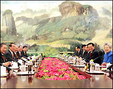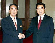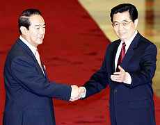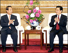 | General Secretary of the Communist Party of China Central Committee Hu Jintao (R.) shakes hands with Soong at the Great Hall of the People, Beijing on May 12, 2005. |