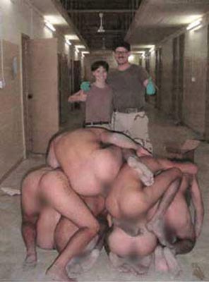 Two American soldiers pose next to a pyramid of naked Iraqi prisoners, at Abu Ghraib prison in this undated photo. (China Daily/Reuters)