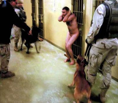 An Iraqi prisoner and American military dog handlers are shown in this photograph from a set of photographs that the New Yorker magazine acquired. According to a time sequence embedded in the digital files, the photographs were taken by two different cameras over a twelve-minute period on the evening of December 12, 2003, two months after the military-police unit was assigned to Abu Ghraib. (Xinhua/AFP)