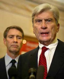 Sen. John Warner, R-Va, and Senate Majority leader Bill Frist, R-Tenn. speak with reporters after viewing more images of Iraqi prisoner abuse in the Capitol, May 12, 2004, in Washington. (China Daily/AP)