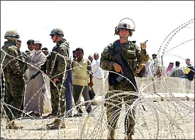 US soldiers stand guard at the entrance of the Abu Ghraib prison, 30 km west of Baghdad, as Iraqis wait to have information about their loved ones held by US forces at the detention center. (China Daily/AP Photo)