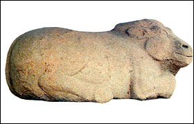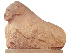 Monstrous beast eating a sheep With short body and long legs, square head and a pair of horns, and sharp fangs, this monstrous beast appears fierce and cruel. It has a sheep in its claws and is eating despite the sheep's resistance. Unfortunately, the sheep is helpless and doomed. This statue made use of an irregular stone 274 centimeters long and 220 centimeters wide. By means of a relief technique, beast and sheep are clearly defined, though their images are in the same stone.
