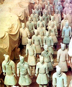 The burial pits are 1,000 meters from the east wall of Emperor Qin Shi Huang's mausoleum and north of the east gate. The figures are placed in battle array as palace guards to protect the underground imperial palace.