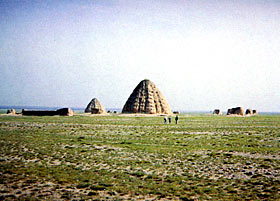 The unique characteristics of Western Xia mausoleums are clearly visible on the spiritual terraces. The mausoleum mounds of the Han, Tang and Northern Song dynasties are generally high, square-based packed earth mounds with tapering tops cut flat and gently sloped sides. Completely different, the mounds of Western Xia mausoleums look like squat Buddhist pagodas, round or octagonal and about 20 meters high. Examples seen today have five or seven stories, each of which is built with flying rafters overlaid with rows of tiles, richly decorated with an interspersing of glazed green tiles. The sides of the spiritual terraces are painted a deep red, the red walls and the green tiles providing a striking contrast, making it easy to imagine how magnificent the spiritual terraces must have been.