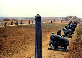 Yongtai Mausoleum: The mausoleum of Emperor Zhe Zong (Zhao Xu), also south of Baling Village. Emperor Zhe Zong was buried here in the 3rd year of the Yuan Fu reign (1100). The tomb base is 50 meters wide east to west, 55 meters long north to south and 21 meters high. Design of this mausoleum is similar to that of the other imperial tombs. Forty-nine stone sculptures remain in front of the mausoleum.
