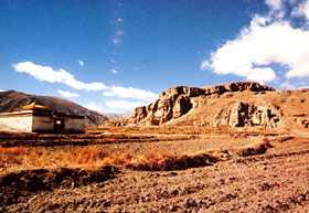 The Tomb of Dusong Mangbujie Halfway up Mure Mountains stands a large elevated platform of earth and stone which, according to Tibetan chronicles, should be the tomb of Dusong Mangbujie. Besides the huge earth heap, the pair of stone lions in front of the tomb are the most valuable surface artifacts. They are each 1.5 meters high, placed on a 1.2-meter-long and 0.8-meter-wide rectangular pedestal. Facing the tomb, they sit chin up and chest out, powerful and expressive. They are obviously in the early style of stone lions, with bald heads and hairy backs. With decisive carving and smooth lines, the two lions can stand among the best carving works of the Tang Dynasty in China, and are even more precious in Tibet.