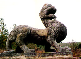 The unicorns and ferocious beasts in front of the tomb of Liu Yu, Emperor Wu Di of the Song Dynasty, are a good example to use for an explanation. With huge stones carved in a rough-cast way, the finished animals exhibit a simple and unsophisticated style, connecting closely with the carving styles of the Han Dynasty.