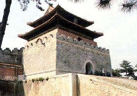 Behind the Long'en Hall are Sanzuo Gate, Two-Pillar Gate, a rectangular five-piece sacrificial stone altar, the square Castle and Soul Tower. The cinnabar tablet in Soul Tower is inscribed with the names of temples for each emperor in Manchu, Han and Mongolian languages. From Soul Tower, a path leads to the Round Castle and its two parts: Precious Dome, and underground palace.