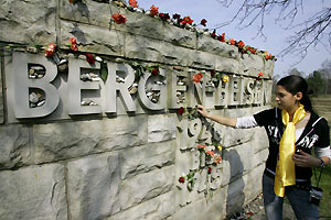 A woman from Israel lays flowers during a ceremony to mourn victims of the Holocaust in Bergen-Belsen, April 15, 2005. Survivors of the Nazi death camp Bergen-Belsen will gather this Sunday to mark the 60th anniversary of the camp's liberation in 1945 and remember the victims of the Holocaust. (Xinhua Photo)