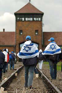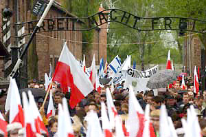 People attending the "March of the Living" walk from the site of Camp No. 1 of the Auschwitz Concentration Camp to that of Birkenau, Camp No. 2 of the Auschwitz Concentration Camp, set up by Nazi Germany, in Auschwitz, Poland, May 5, 2005.