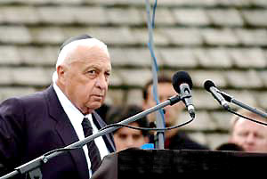 Israeli Prime Minister Ariel Sharon delivers a speech during the "March of the Living" at the site of Auschwitz Concentration Camp set up by Nazi Germany in Auschwitz, Poland, May 5, 2005.