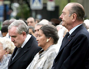 French President Jacques Chirac, right, and French Premier Jean-Pierre Rafarrin, left, attend a ceremony marking the 60th anniversary of the liberation of the Nazi death camps in Paris, Sunday, April 25, 2005. Chirac led a national day of commemoration Sunday for the tens of thousands of Jews, political dissidents and others who were deported from France in World War II. (Xinhua/AFP Photo)