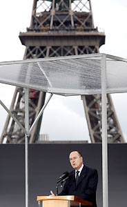 French President Jacques Chirac gives a speech in Paris, April 24. Thousands of veteran WWII soldiers and victims gathered there to commemorate 60th anniversary of the liberation of the Nazi death camps in Paris, Sunday. (Xinhua/AFP Photo)
