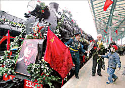 A boy hands a flower to a WWII veteran arriving in a Moscow train station as part of the celebrations marking the 60th anniversary of the Allied victory over Nazi Germany in WWII yesterday in Moscow. The train had started its journey seven days before from Belarus to finish at Belaruskaya station, where the soldiers arrived 60 years ago when coming back from war. (Xinhua/AFP Photo)