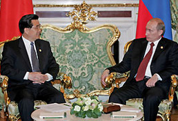 President Hu Jintao and his Russian counterpart Vladimir Putin met in Moscow yesterday to discuss bilateral relations and international issues.