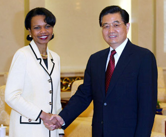 During her meeting with Hu, Rice said the US Government attaches great importance to developing US-China constructive and co-operative ties, and that people around the world are watching the "remarkable transformation" that is going on in China.