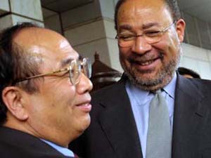 Zhao Qizheng (left), minister of China's State Council Information Office, chats with Richard D. Parsons, chairman of the board and CEO of Time Warner during the ongoing Fortune Global Forum in Beijing at the Diaoyutai State Guesthouse on May 17, 2005.