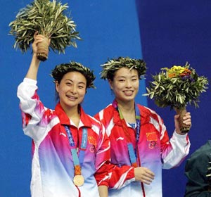 Tian Liang and Yang Jinghui won the men's synchronized 10-meter platform while Guo Jingjing, widely reported as Tian's girlfriend back home, paired with Wu Mingxia to claim the first diving gold in the women's synchronized 3m springboard.