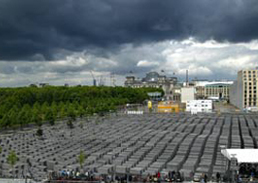 The vast memorial, designed by US architect Peter Eisenman, consists of 2,711 dark gray concrete pillars, which together produce an impression of an open grave yard.