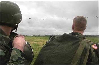Comrades watch as American parachutists jump over Sainte-Mere-Eglise, northern France, June 5, 2005, to commemorate the Allied D-Day landings of World War II. Rain dampened plans for about 150 military parachutists, with Germans taking part for the first time, to leap over the first Normandy town freed from the Nazi grip on June 6, 1944. (China Daily/AP Photo)