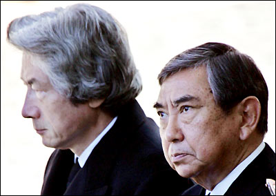 A 2004 file photo of Japan's House of Representatives Speaker Yohei Kono (R) and Prime Minister Junichiro Koizumi. Kono on June 7, 2005 indirectly urged Koizumi to stop visiting the controversial Yasukuni Shrine in Tokyo. In a meeting with Koizumi on bettering bilateral ties between Japan and China, Kono was quoted as telling Koizumi to "decide whether to visit the shrine with utmost caution." (Xinhua Photo)