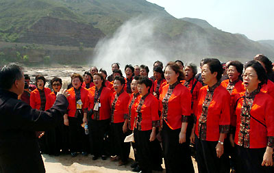 An international chorus festival opens June 11, 2005 at the famous Hukou falls on the Yellow River in Shanxi Province. Four overseas Chinese choirs from Singapore, Malaysia and Australia attended the festival. Chinese singers from home and abroad sang songs in commemoration of the 60th anniversary of the victory of the War of Resistance Against Japanese Aggression (1937-1945) and the centennial birth anniversary of Xian Xinghai. Xian, a great musician, composed at the Hukou falls in 1939 the Yellow River Cantata, a household song that inspired the Chinese people to fight against Japanese aggression. (Xinhua photos)