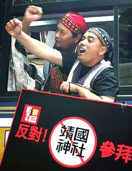 A group of Taiwan aborigines raise their fists and hold a banner protesting against possible visit to the Yasukuni Shrine by Japanese Prime Minister Junichiro Koizumi in Tokyo June 14, 2005. Koizumi's visit to the shrine, where convicted WWII war criminals are honored along with Japan's 2.5 million war dead, has been at the heart of diplomatic rows with China and South Korea and domestic pressure is mounting on him to stop going. A group of about 60 aborigines from Taiwan were prevented by Japanese police from approaching the shrine. (China Daily/Reuters Photo)