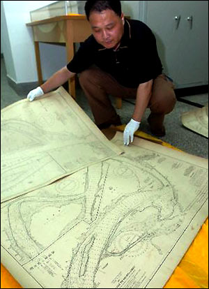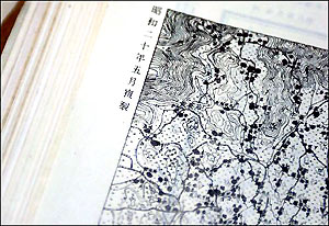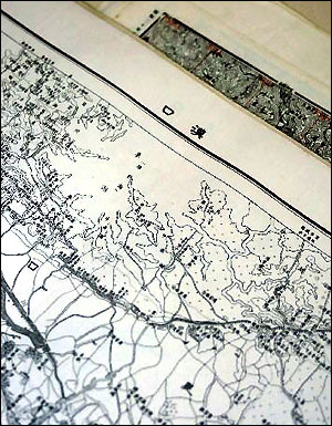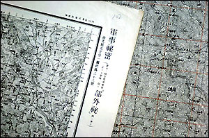 These photos taken on June 21, 2005 show military maps used by the Japanese aggressors in the 1930s and 40s, which were made public by the Hubei Provincial Archives recently. (Xinhua photos)