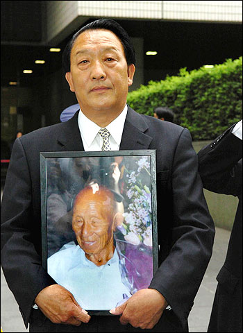 Liu Huanxin, son of late Chinese forced laborer in Japan Liu Lianren, holds his father's photo to protest against the Tokyo High Court's verdict in Tokyo June 23, 2005. The Tokyo High Court on Thursday denied compensation to the family of Liu Lianren who escaped from a work site toward the close of World War II and hid in mountains for about 13 years unaware the war had ended. (Xinhua photos)