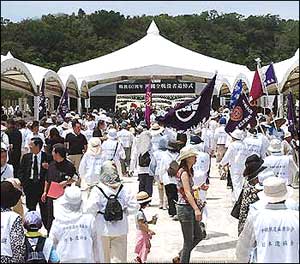 Japanese people assemble to pay their respects at a memorial ceremony marking the 60th anniversary of the WWII Battle of Okinawa at Cornerstone of Peace Park in Itoman, on the southern Japanese island of Okinawa, June 23, 2005. (China Daily/Reuters Photo)