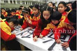 Pupils of a primary school in Hefei, capital of central China's Anhui province, sign on a large scroll to denounce Falun Gong cult on the first day of new term on February 5. The recent suicide attempts by a group of Falun Gong Practitioners at Tiananmen Square in Beijing astonished and awakened more and more Chinese people to realize the nature of the evil cult.