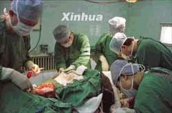The Falun Gong practitioners made suicidal attempts by setting themselves on fire at the Tiananmen Square on January 23. Thanks to careful treatment by doctors and nurses, they are now in stable condition. The photo shows the doctors and nurses of Jishuitan Hospital having a skin graft on Chen Guo, 80 percent of whose skin was burnt.