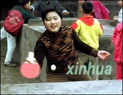 Yang Qin, a former Falun Gong follower, plays table tennis with one of her students of Tongxin Primary School in Daxing Township, south China's Chongqing municipality, Saturday, February 17, 2001.