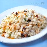 Ingredients: 250 grams (0.55 lb) cooked rice 10 grams (1/3 oz) shrimp 10 grams (1/3 oz) cooked sausage (chopped) 10 grams (1/3 oz) cooked ham (chopped) 10 grams (1/3 oz) mushrooms (chopped) 10 grams (1/3 oz) green peas 10 grams (1/3 oz) carrots 5 grams (1/6 oz) scallions (chopped) 2 grams (1/3 tsp) salt 1 gram (1/4 tsp) MSG 15 grams (1 tbsp) sesame oil
