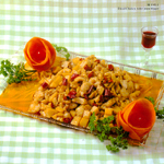 3. Heat the oil in a wok over strong fire to 70-110?C(160-210?F) and slippery-fry the chicken dices until they are done. Take out and drain off the oil.