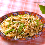 Directions: 1. Cut the chicken breast into shreds 5 cm (2 inches) long and 0.25 (0.1 inch) thick and wide. Place in a bowl and add the egg white, 2 g (1/3 tsp) of salt and 10 g (1 1/2 tbsp) or dry cornstarch and mix well. Cut the green peppers into shreds to the size of the chicken shreds. Mix the remaining cornstarch with water.