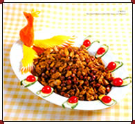 Ingredients: 250 grams (0.55 lb) chicken breast 150 grams (0.33 lb) peanuts 500 grams (1 cup) oil (only 75 g or 5 tbsp to be consumed) 1 egg white 12 g (1 2/3 tbsp) dry cornstarch 2 grams (1/3 tsp) salt 1 gram (1/4 tsp) MSG 10 grams (1 1/2 tsp)soy sauce 10 grams (2 tsp) sugar 2 dried red chilies 2 grams (1/15 oz) finely cut scallions 2 grams (1/15 oz) chopped ginger 50 grmas(3 tbsp) water 5 grams (1 tsp)cooking wine 5 grams (1 tsp) sesame oil