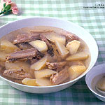 (2) Put 1,000 grams (2 cups) of water in a pot, add the pork ribs and bring to boiling point. Skim off the foam. Add the potaotes, cooking wine and salt, and set on a low fire to cook for 1 hour or until the meat is quite soft. Add the MSG mand serve.