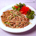 2. Heat the oil in a wok over strong fire to 110-135?C (230-275?F ) and quickly slippery-fry the duck shreds. Put in a strainer to drain off the oil.