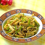 Ingredients: 350 grams (0.77 lb) asparagus 150 grams (0.33 lb) green peppers 1 gram (1/6 tsp) salt 1 gram (1/4 tsp) MSG 10 grams (2 tsp) cooking wine 200 grams (15 tbsp) salad oil (only 1/4 to be consumed) 50 grams (3 tbsp) water 15 grams (3 tsp) mixture of cornstarch and water