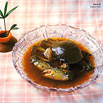 Ingredients: 10 live crabs about 1,500 grams (3.3 lb) 500 grams (1 cup) strong liquor 500 grams (1 cup) cooking wine 25 grams (4 tsp) salt 2 1/2 grams (1/12 oz) Chinese prickly ash 25 grams (5/6 oz) deied orange peel 10 grams (2 tsp) sugar 50 grams (1 2/3 oz) sliced ginger