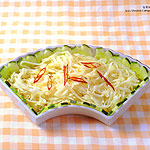 2. Heat water and bring it to a boil. Quick-boil the shredded cabbage, drain off the water and put in a basin. Sprinkle on the shredded chilies.