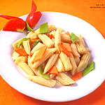 Ingredients: 400 grams (0.88 lb) baby corn 50 grams (0.11 lb) carrots 10 grams (1/3 oz) green peppers 50 grams (3 1/2 tbsp) salad oil 1 gram (1/4 tsp) MSG 2 grams (2/5 tsp) cooking wine 2 grams (1/3 tsp) salt 2 grams (2/5 tsp) sesame oil 50 grams (3 tbsp) water