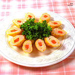 2.Put the egg wrapping flat on a chopping board, spread hte dry cornstarch evenly on top of it, and then evenlly spread on the ground meat. Roll meat up into a long roll. Place roll around the edge of a plate to make a ring and steam for 8 minutes. Take off and cut roll into diamond shapes to serve on a plate.