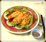 Ingredients: 1 young chicken (about 600 g or 1.3 lb), inside removed 100 grams (0.22 lb) wheat flour 2 eggs 1000 grams (2 cups) cooking oil (only 1/20 to be consumed) 5 grams (5/6 tsp) salt 1 gram (1/4 tsp) MSG 5 grams (1 tsp) cooking wine 5 grams (1 tsp) sugar 10 grams (1/3 oz) finely cut scallions 10 grams (1/3 oz) chopped ginger