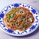 3. Heat the oil in a wok to 70-100:C (160-210:F). Put in the beef strips and stir-fry until they are done. Take out and drain off the oil.