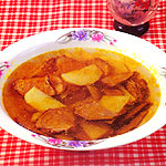 Ingredients: 300 grams (2/3 lb) potatoes 150 grams (1/3 lb) fore shank of beef 5 grams (1/6 oz) sectioned scallions 5 grams (1/6 oz) sliced ginger 15 grams (3 tsp) cooking wine 5 grams (5/6 tsp) salt 2 grams (1/2 tsp) MSG 1 gram (1/2 tsp) pepper powder