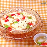 1. Wash the agar. Put 100 g (6 tbsp) of water in the pot and boil the agar over a low heat until it is completely melted. Add the milk, ground almond, 50 g (0.11 lb) of sugar and mix well as it is being cooked. Take it out when it starts to boil. Put it in a plate and when it cool off, put in a freezer.