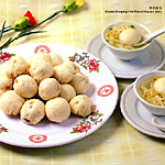 4. Roll the risen dough well and make it into the shape of a roller, reduce it to pieces each weighing 8 grams (1/4 oz), press and roll into round wrappings. Put in the filling and seal it by folding the edge together. Leaving the sealed part on the downside and put in a steamer. When the water (2,000-2,500 g or 4 to 5 cups) start to boil, steam for 10 minutes before the dumplings are ready.